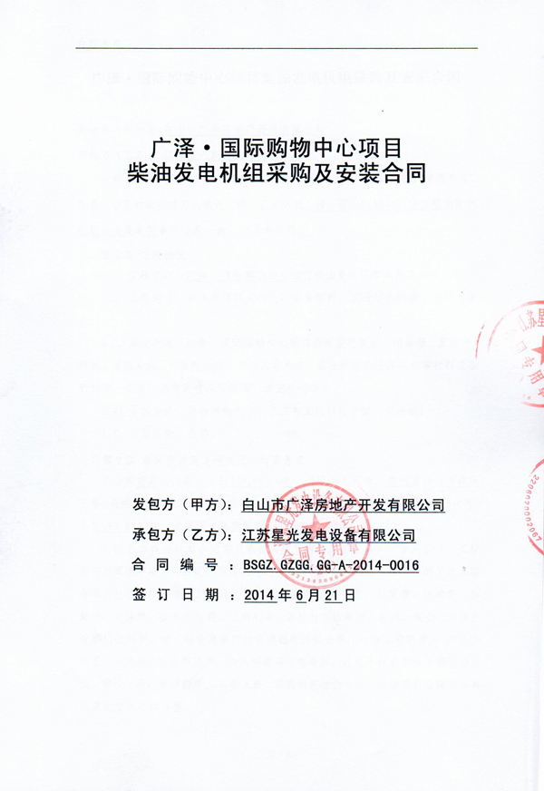 廣澤國際購物中心項目柴油發(fā)動機組采購及安裝合同