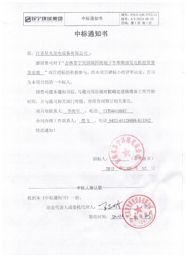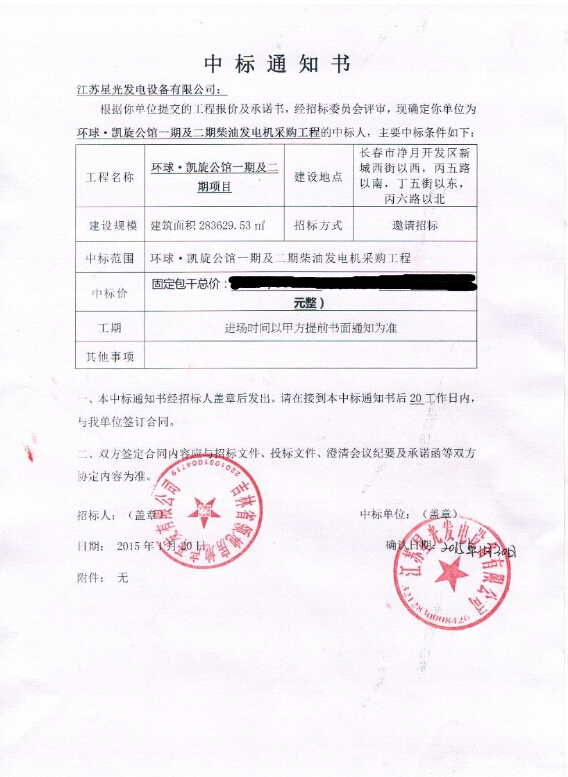 中國神華國際工程有限公司發(fā)電機組采購中標(biāo)通知書